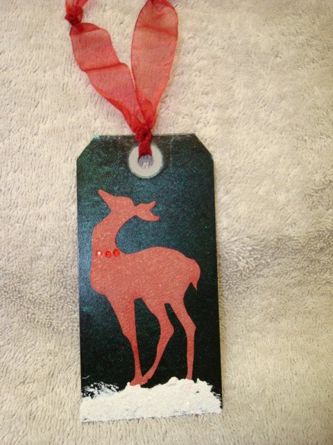 I cut the reindeer out of grunge paper. I then sprayed it with tattered angel candy apple red and added rhinestones around his neck. I sprayed the tag with PK Glitz green. I added snow-tex to the bottom of the tag and sprinkled it with diamond dust. I added a ribbon for the tassel. Simple but very pretty. The photo doesn't show the mists very well.